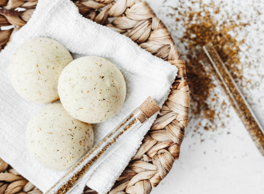 Półkula kąpielowa z maceratem z nagietka i olejkiem eterycznym ze słodkiej pomarańczy.